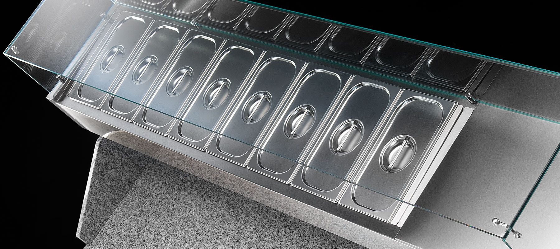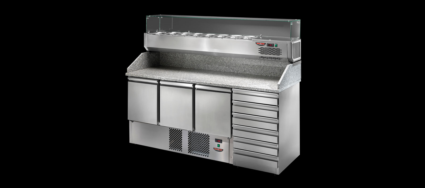 2/3 doors Saladette Pizza counter with refrigerated ingredients display and built-in unit.