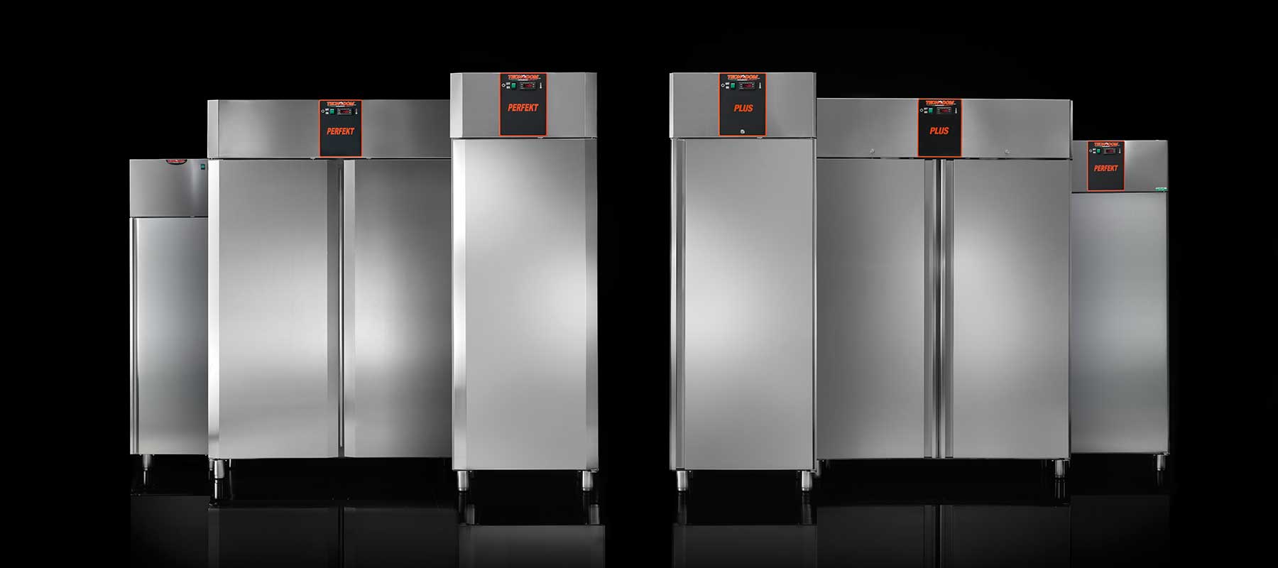 Perfekt combined refrigerated cabinets and fridge-freezers with capacities of 700 / 1200 / 1400 litres, available with 1 or 2 opposing stainless steel or glass doors, or with 1 door and 2 half doors, or 4 stainless steel half doors.