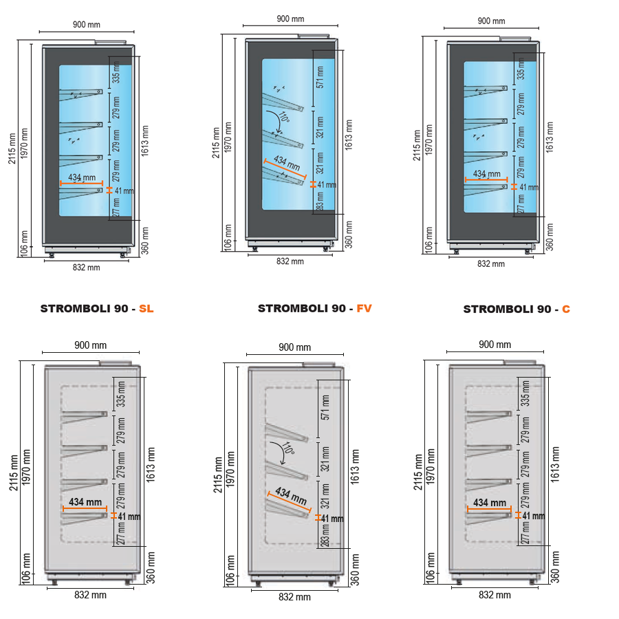Off-cycle defrosting for Cold cuts and Dairy products versions (SL) and Fruit and Vegetables versions (FV).