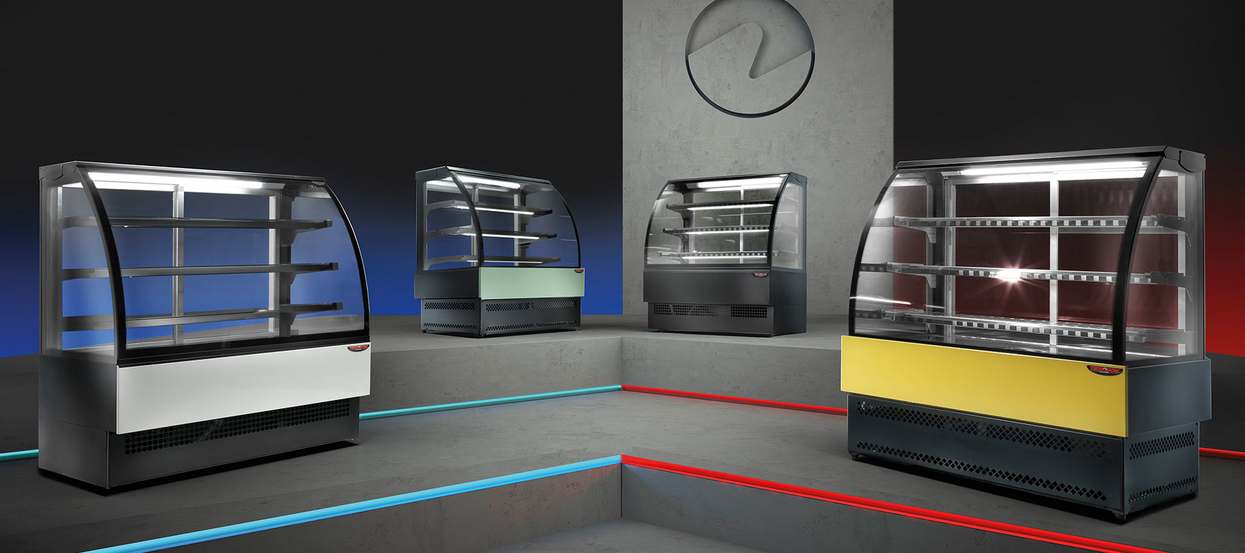 Refrigerated display with curved tempered glass. Suitable for displaying gastronomy, pastries, cold meats, dairy products, snacks and drinks.